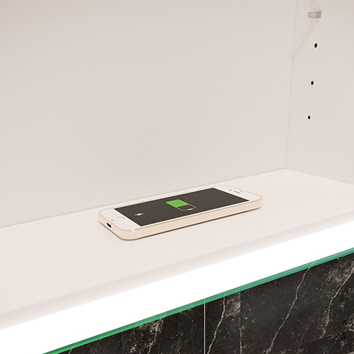 Nabíjejte telefon během ranní toalety! Telefon můžete vždy nabíjet pomocí indukční nabíječky umístěné uprostřed skříňky. Jednoduše položte telefon na indukční symbol a smartphone se začne nabíjet.